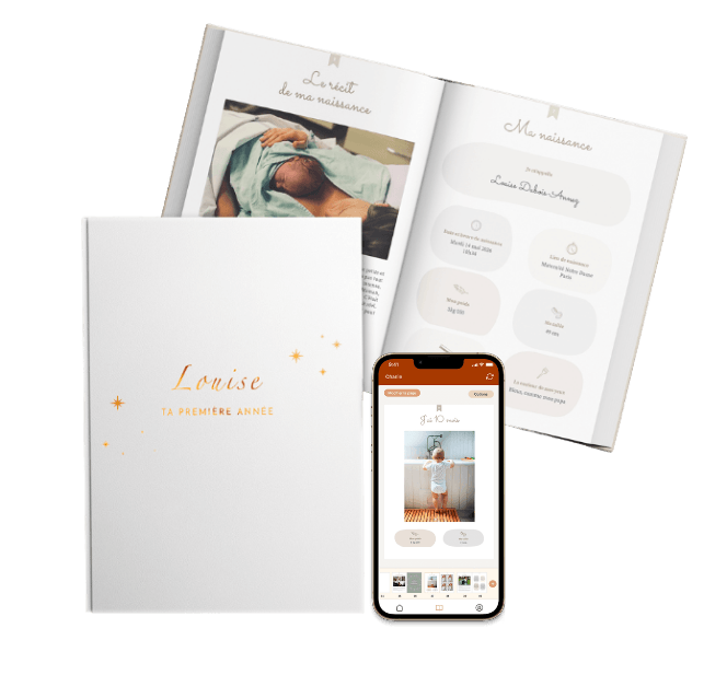 Créez votre livre de naissance de A à Z directement depuis notre application. Ajoutez vos photos, rédigez vos souvenirs, choisissez votre mise en page et personnalisez chaque page au fil des mois, en toute simplicité.